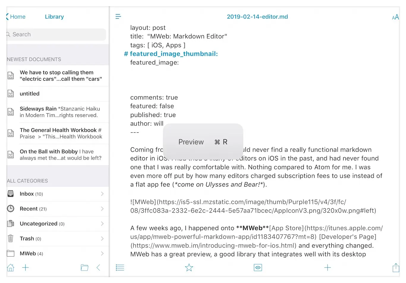 A few weeks ago, I happened onto MWeb and everything changed. MWeb has a great preview, a good library that integrates well with its desktop version, and allows easy editing of files in external folders, including the git repository that hosts this site.